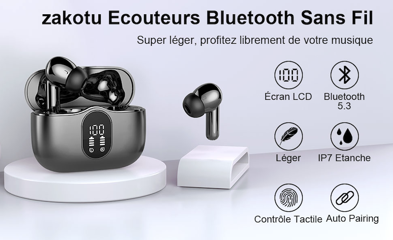 Les écouteurs Bluetooth sans fil Oreillettes Bluetooth 5.3 avec HiFi Stéréo, réduction de bruit et mic, écran LCD, contrôle tactile