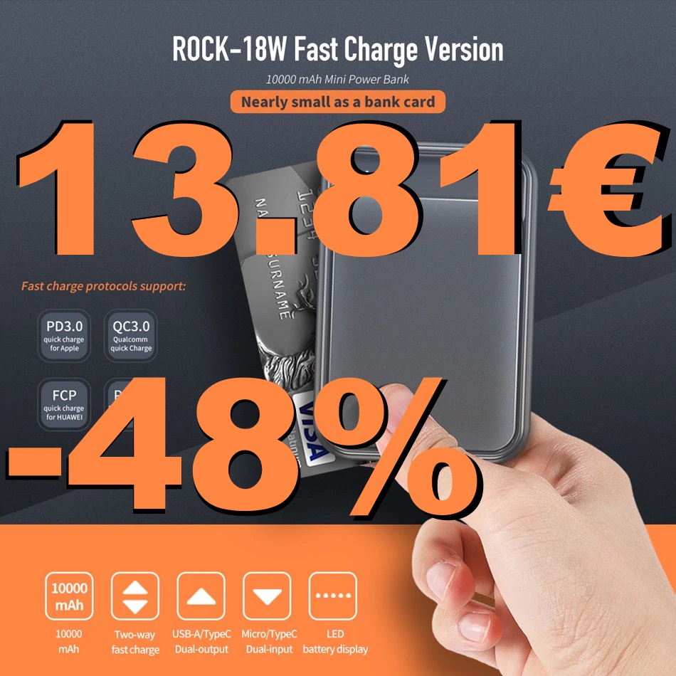 | ROCK 18W Type C PD QC 3.0 Power Bank 10000mah Mini External | 13.31€ | -48% | http://s.click.aliexpress.com/e/c0lvc7Hm | ||