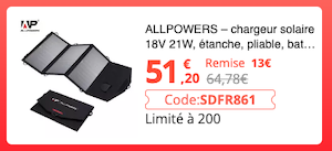 Code promo panneaux solaire Pliable ALLPOWERS chargeur de batterie 12V pour voiture, téléphone portable, randonnée en plein air … Profitez De