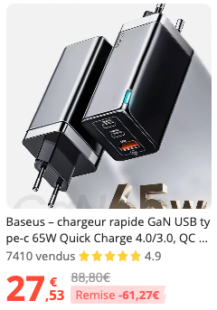 Code promo Chargeur rapide GaN USB type-c 65W Quick Charge 4.0/3.0, QC PD3.0/PD USB-C, pour iPhone 14/13 Pro et MacBook