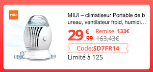 Code promo climatiseur Portable de bureau Xiaomi Miui 29,99€ avec le code promo Climatiseur portable Xiaomi SD7FR14 : https://s.click.aliexpress.com/e/_DeBhVTd By