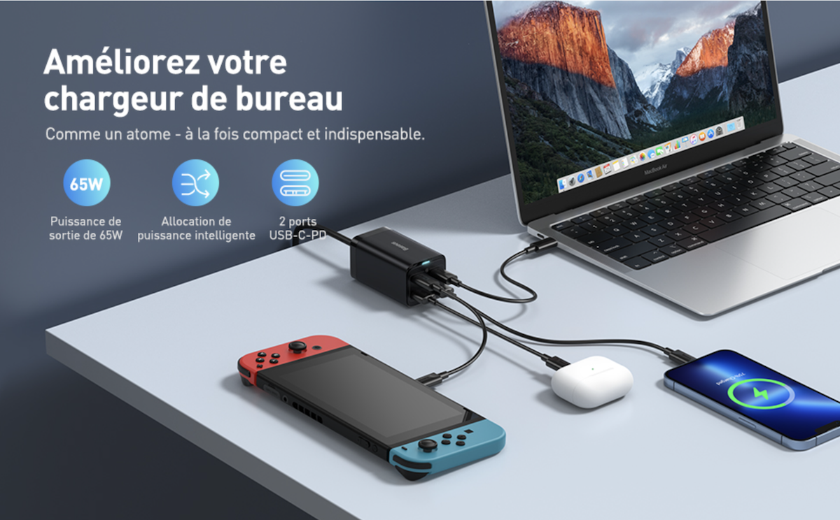 Vous cherchez un chargeur rapide et polyvalent pour vos appareils électroniques ? Ne cherchez plus ! Le chargeur USB C rapide 65W de Baseus est la solution idéale pour charger simultanément plusieurs appareils électroniques, tels que votre téléphone, votre ordinateur portable, vos écouteurs sans fil, etc. Et avec une remise de 32%, ce chargeur est un excellent investissement pour votre bureau ou votre domicile.