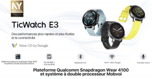 La Ticwatch E3 est équipée de la plate-forme Qualcomm Snapdragon Wear 4100+, offrant des performances plus rapides et plus fluides, tout en préservant la durée de vie de la batterie. Elle dispose également de plus de 20 modes d’entraînement professionnels, d’un système GPS intégré, de la surveillance de la fréquence cardiaque, du suivi du sommeil et de la gestion du stress. Propulsée par Wear OS by Google, vous pouvez vous connecter aux applications quotidiennes et effectuer des paiements sans contact avec Google Pay. Avec un écran HD de 1,3″ et un poids ultra-léger de seulement 32g, cette montre est idéale pour ceux qui cherchent à allier performance et style.