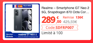 Code promo Smartphone Realme GT Neo 2 5G, Snapdragon 870 Octa Core, 8 go 128 go, écran 6.62 pouces 120Hz AMOLED E4, Triple caméra AI 64mp, 65W, NFC ….