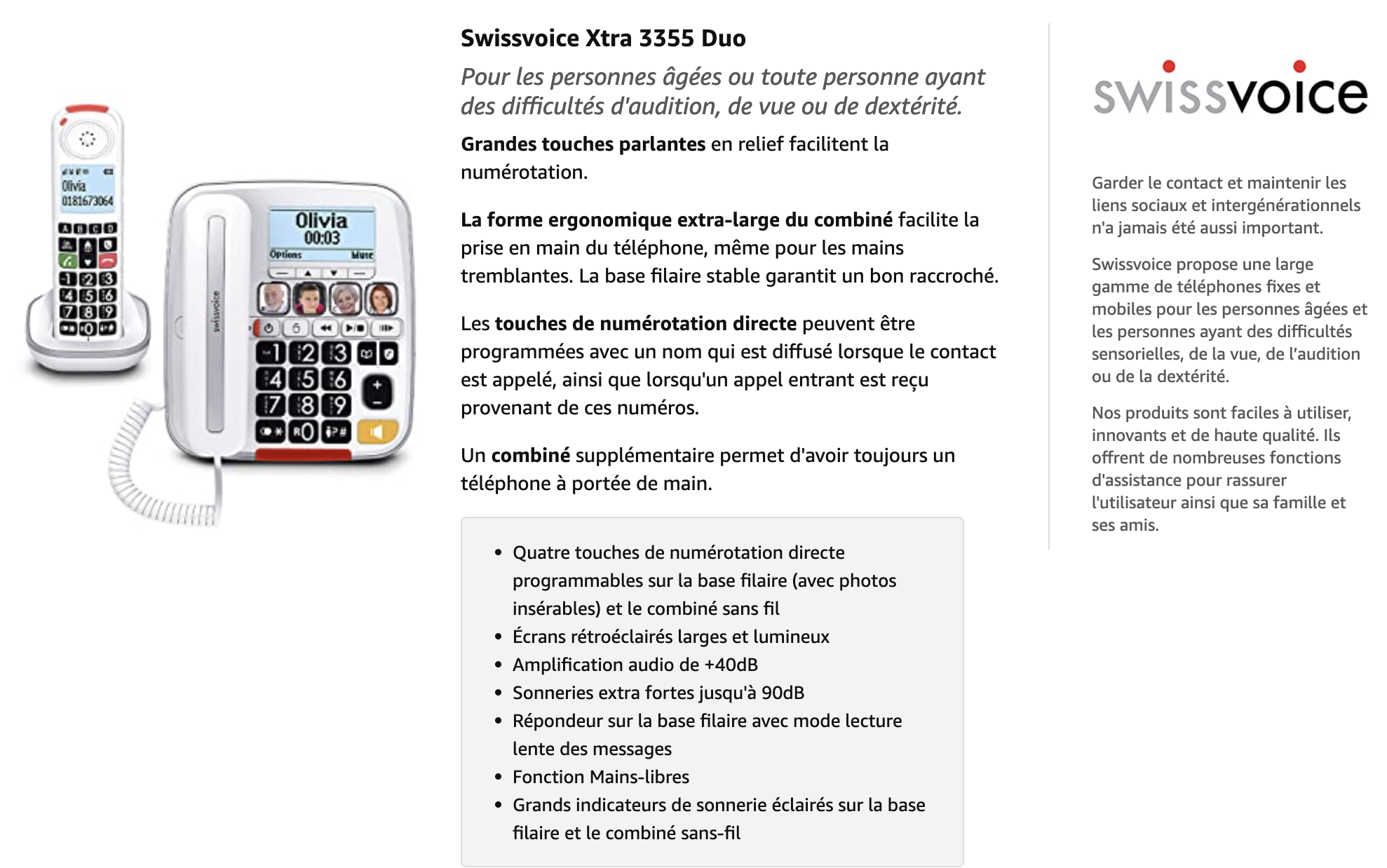 Profitez de cette offre exclusive avec un code promo de -7% soit 93,25€ pour vous offrir le Swissvoice Xtra 3355 Combo, un téléphone filaire à grosses touches avec répondeur et combiné additionnel, audio boost et sonneries fortes, compatible avec les appareils auditifs.