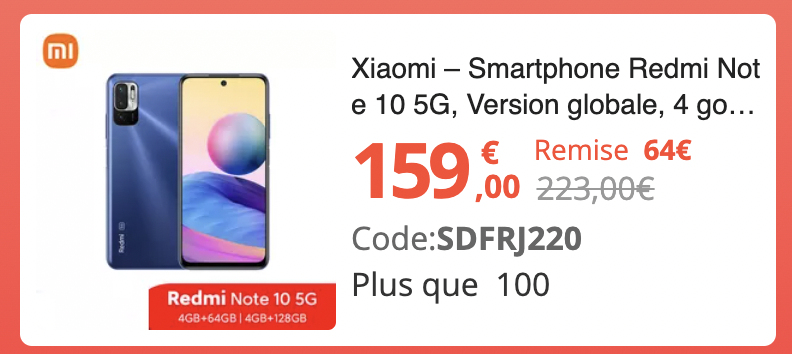 Code promo Xiaomi Redmi Note 10 5G, Version globale, 4 go + 64 go/128 go, Triple caméra 48mp, écran 6.5 pouces 90Hz, 5000mAh, dimension 700 NFC
