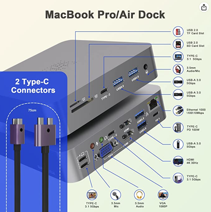 Le nouvelle station MacBook Pro/Air avec double HDMI + VGA, RJ45 1000 Mo/s, PD 100 W, USB-C 3.1 x2 +