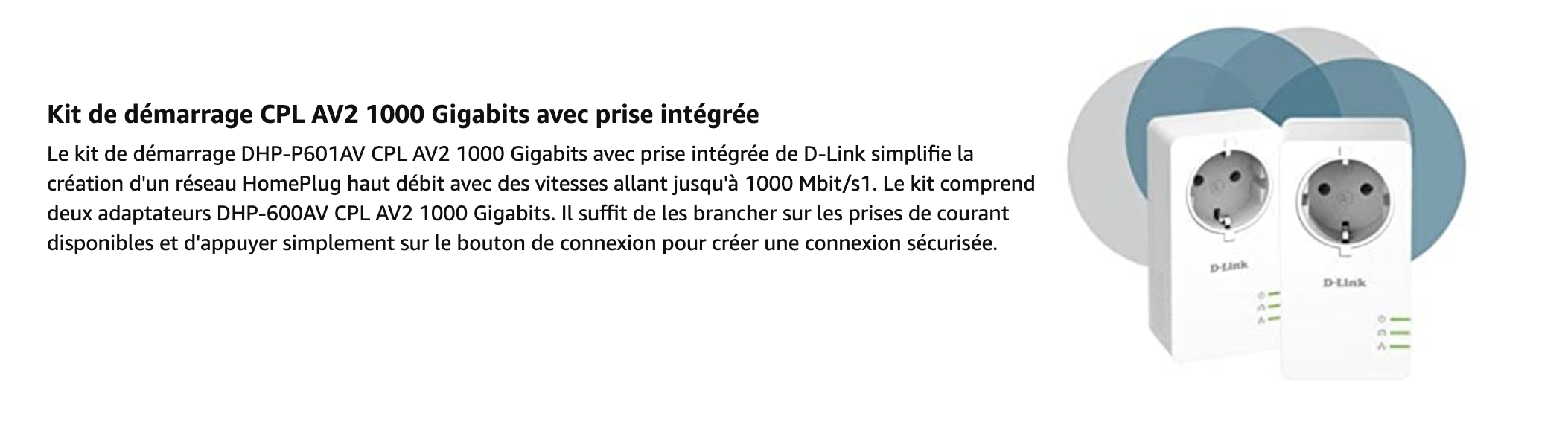 Le kit D-Link DHP-P601AV/FR CPL 1000 mbps est le moyen idéal de profiter du service multi-TV à la maison avec des vitesses allant jusqu’à 1000 Mbps. Grâce à sa conception avec prise intégrée, l’utilisation continue de la prise électrique est possible. Le kit comprend 2 adaptateurs DHP-P600AV pour que les utilisateurs puissent se connecter immédiatement, sans besoin de compétences informatiques. Les adaptateurs sont compatibles avec les téléviseurs, les consoles de jeux et les ordinateurs intelligents, ainsi qu’interopérables avec d’autres adaptateurs CPL D-Link et d’autres adaptateurs à la norme Homeplug AV2. Le chiffrement des données sécurisé AES 128 bits assure la confidentialité des données. Ne manquez pas l’offre exceptionnelle de 6%, soit 44,99€, et profitez de la dernière technologie CPL avec le kit D-Link DHP-P601AV/FR.
