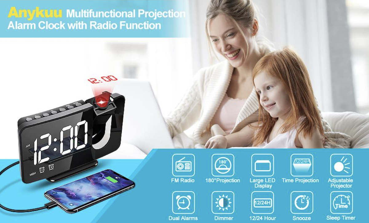 Le Anykuu Radio Réveil offre une projection à 180° et 4 niveaux de luminosité. Grâce à cette fonction, vous pouvez projeter l’heure sur le plafond ou le mur, et régler la distance de projection optimale entre 4 et 12 pieds. La luminosité de la projection est également ajustable selon vos préférences : forte, moyenne, faible ou éteinte.