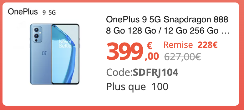 Code promo OnePlus 9 5G Snapdragon 888 8 Go 128 Go / 12 Go 256 Go Smartphone 6,55 pouces 120
