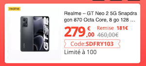 Code promo smartphone Android Realme GT Neo 2 5G Snapdragon 870 Octa Core à 279€